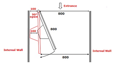 When a door is opened 90° (parallel to the wall), the distance between the edge of the open door and the wall is primarily determined by the jamb width. In all cases where the jumb width is equal to or more than the projection of the fitted IdealGuard™ product, it will not affect the door's clear opening width as it fits into this space. Usually, this is the case.